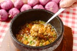 当店のガーリックライスは一度、お米を野菜と一緒に炊き上げて甘みを引き出したご飯を、オーダー毎にガーリックと共にお客様のテーブルにて石焼きで香ばしく再調理してお出ししています。カリカリのおごげもお楽しみ下さい。