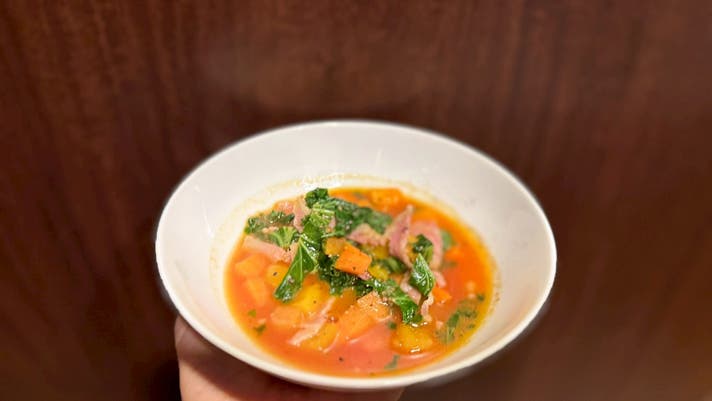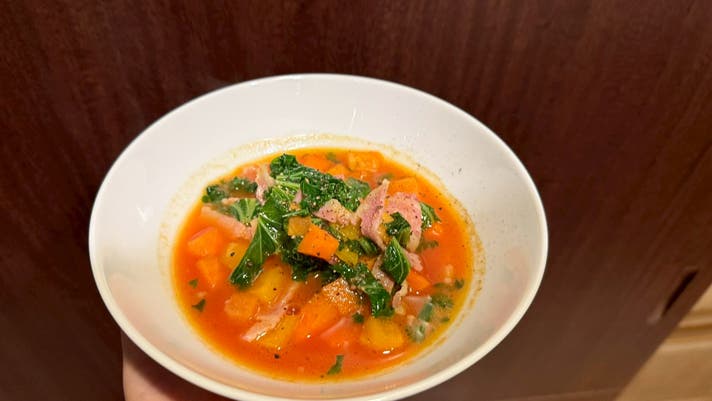 ②山ちゃんジュースとお水を入れて、塩胡椒で味を整えると美味しいスープの出来上がりです。