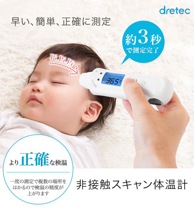 非接触スキャン体温計は肌に触れずに衛生的で、約3秒で検温できます!
