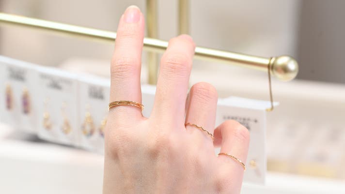 華奢なこのK18リングだからこそ、何本重ねてもやりすぎ感も重くもなりすぎません。