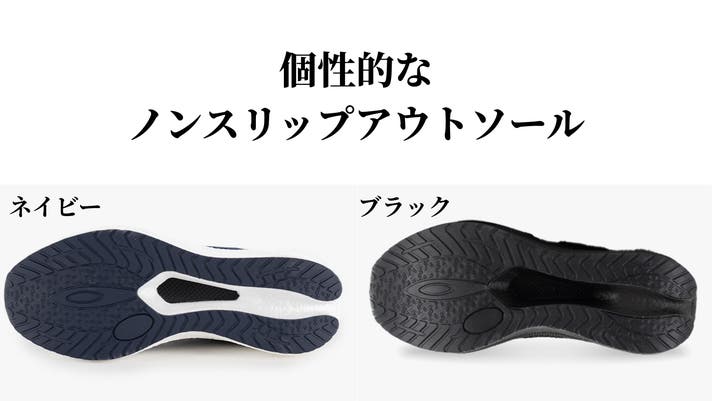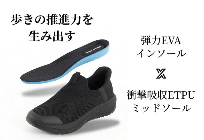 - 歩きに推進力!ヘタリの少ない超弾力ETPUクッション、ノンスリップアウトソール