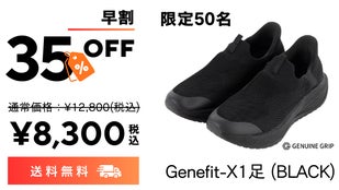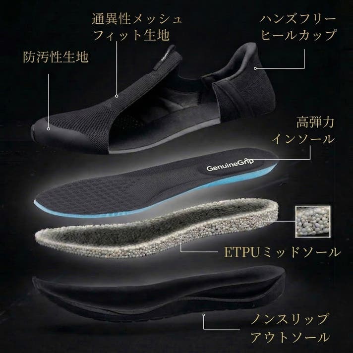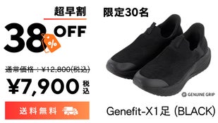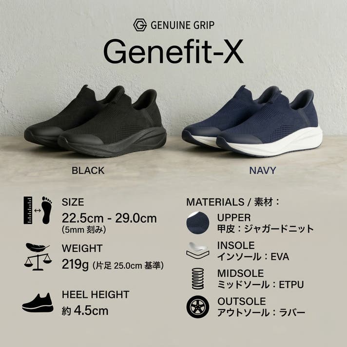 今回開発したGENUINE GRIP Genefit- Xは靴ベラ要らずの履きやすさとアウトソールからインソールに至るまで無重力感覚の高性能クッショニングとなっています。高機能性新素材のETPUを使用し、歩きの極限を追求し時間をかけて製作したシューズです。我々の特徴であるノンスリップ性能も装備していますので是非Genefit-Xで無重力体験をお試しください。