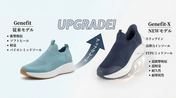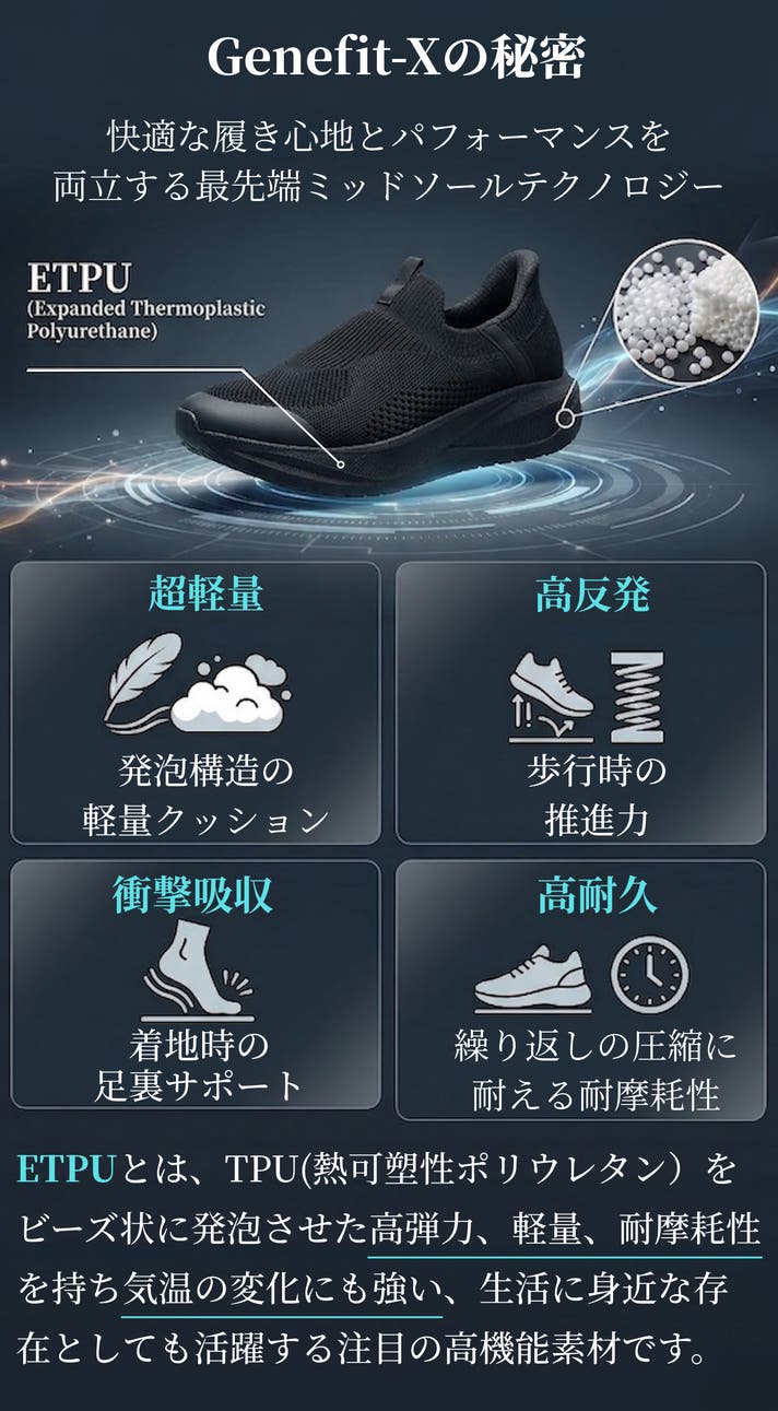 「Makuake(マクアケ)」は、実行者の想いを応援購入によって実現するアタラシイものやサービスのプラットフォームです。このページは、 ファッションカテゴリの 「ストンと楽に履き無重力感覚の新素材ETPUソールで快適歩行!Genefit-X」プロジェクト詳細ページです。