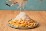 ダブルチーズを山盛り!レッドチェダーとパルミジャーノの削りたてチーズが複雑に絡み合う!チーズ屋さんのカルボナーラ♪
