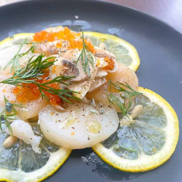 新鮮なホタテとブルーチーズを掛け合わせた「ホタテと生ホワイトマッシュルームのカルパッチョ~ゴルゴン風味~」