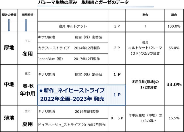 2014年、脱脂綿を極力薄くしたパシーマ生地の開発を龍宮(株)へ頼み込み、何度も挑んでいただき、【薄地の夏用】が増え、3種類になりました。