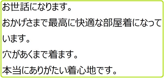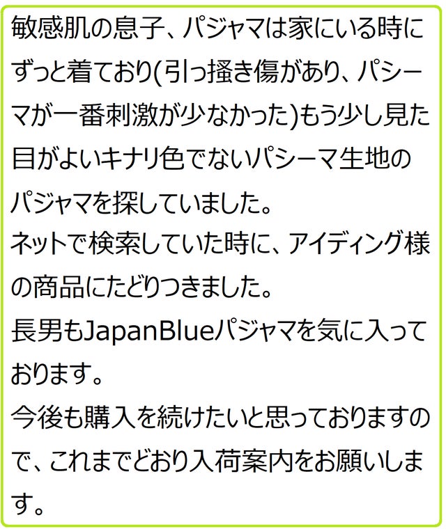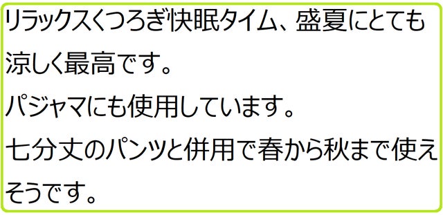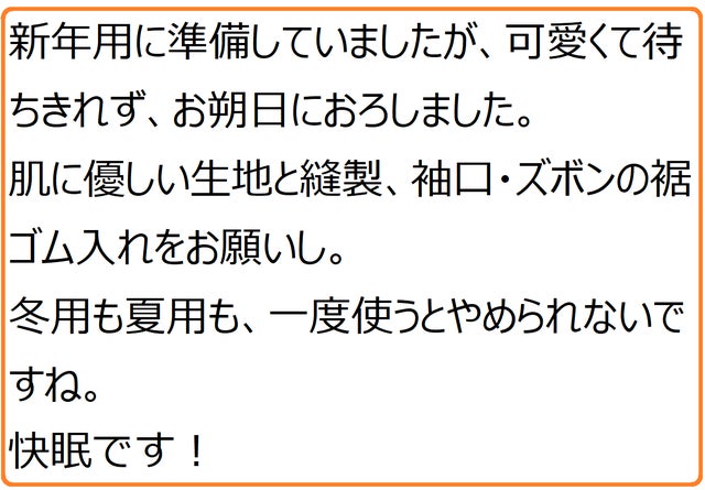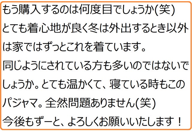 「就寝中も昼間も着心地が良くて、ずっと着たまま。ワクワク楽しい色柄ものが欲しい。」