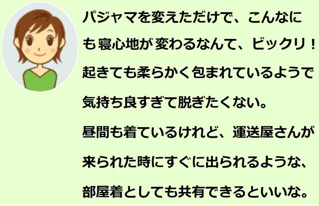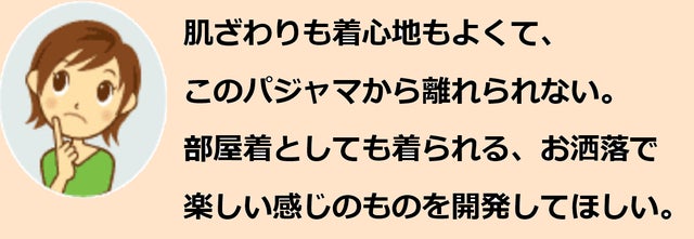 「目覚めても気持ち良くて脱げずに着てるので、運送屋さんが来られた時など、すぐに出られない。パジャマでも部屋着にもなるようなものを作ってほしい。」と、