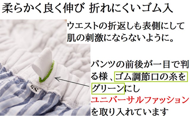 アトピーや敏感肌のお客様が多い為、一般的なサイズより、少しゆったり目に出来上がっていますので、細身の方、ふっくらさんの方へ、ゴムサイズの修正を承ります。