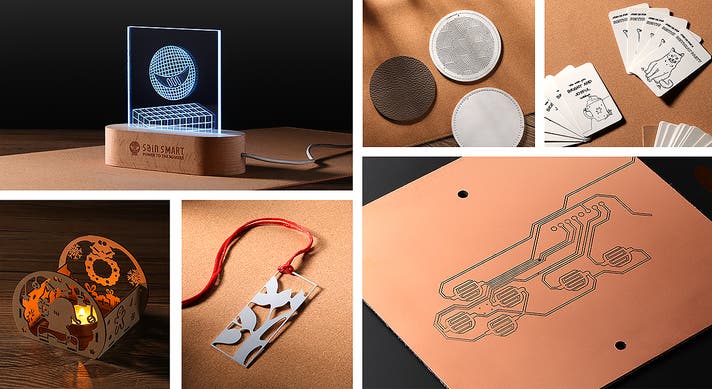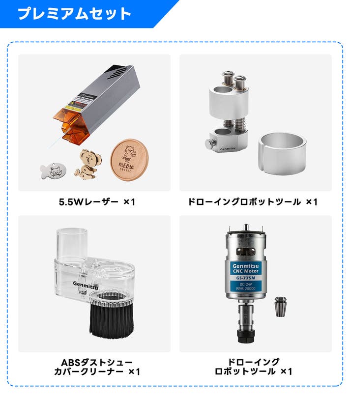 デスクに置くことができる小型CNCマシンなので、木材・アクリル・革・PCBなど、DIYやハンドクラフト向けの素材加工に最適です。さらに、プレミアムセットをご購入いただくと、オプションのレーザーモジュールがセットに!レーザー彫刻やカットも可能になります!