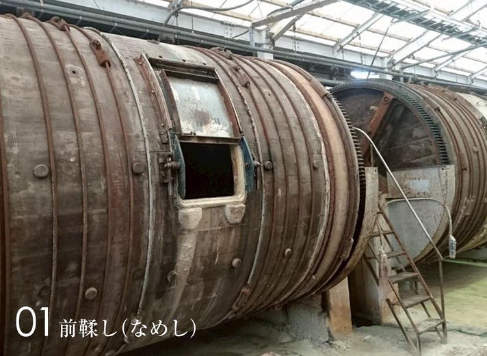 塩漬けされた原皮を巨大な専用ドラムで24時間かけて“水戻し”し、皮に命を吹き込む作業など、