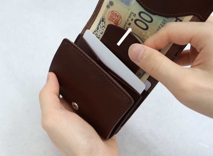 小銭・カード・お札、すべて財布の向きを変えずにスムーズに出し入れできます。