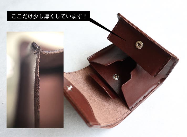 当初は、薄くすいた革を均一に使っていました。しかし、小銭入れを大きく開けやすくするために、