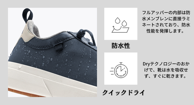 クイックドライ HDryテクノロジーのおかげで、靴は水を吸収せず、すぐに乾くの快適に履いていただけます。