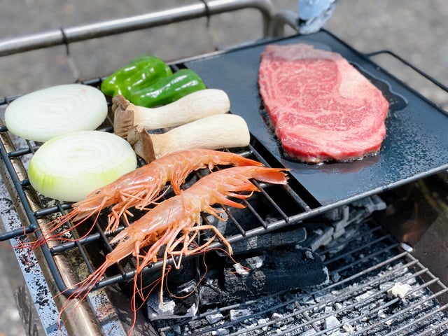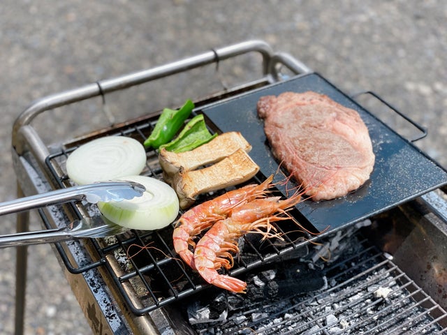 鉄板でお肉、網で魚介類や野菜類など、食材に合わせた使い分けが可能です。