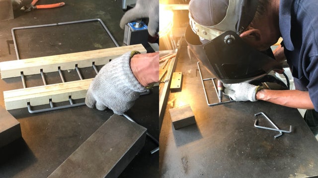 その後木型で位置にズレが生じないよう、網目となる中の丸棒(2.9φ)を溶接していきます。