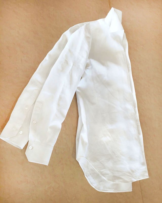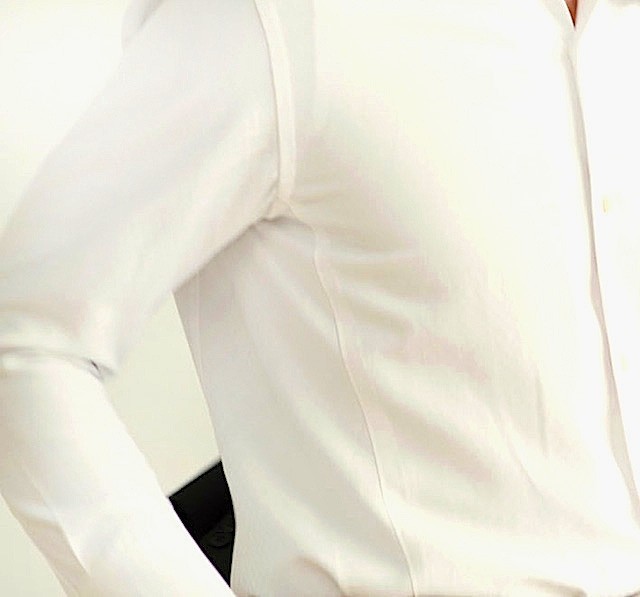 岐阜シャツは一般のシャツとは型紙・縫製パターンの方法が異なります。ジャケット製造の方法論を採用し、腕周りや脇のパターンをより立体的にパターンメイクし、よりジャケットに近いシルエットになるように研究を重ね、立体的な仕立てを行いました。このため、腕の稼動域が広く、腕を上げてもシャツの裾が出にくいようになっています。
