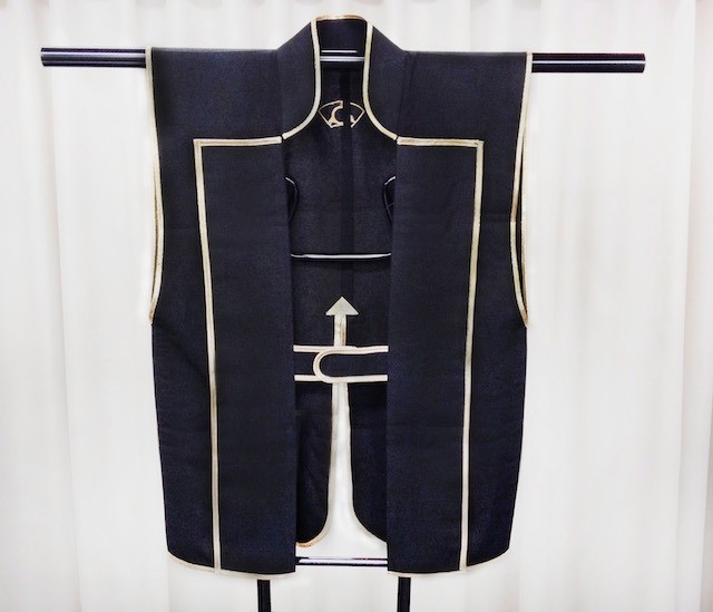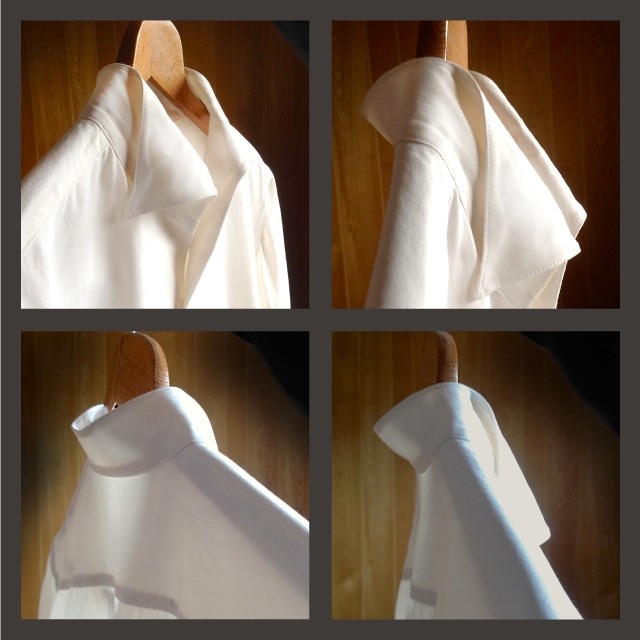信長の陣羽織をモチーフに、襟には、ウイングカラーとイタリアンカラーが融合した縦襟を採用。襟のボリューム感を出すために、ジャケットを着用しないときにはスナップボタンで留めるようになっています。ジャケット着用時には、スナップボタンをはずしオープンカラーで着ていただけます。
