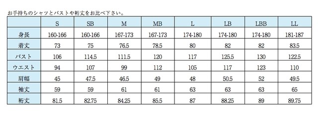 A. サイズ表は、シャツを直接計った寸法です。少し細めの作りになっていますので、お手持ちのお気に入りのシャツと比べてお選び下さい。