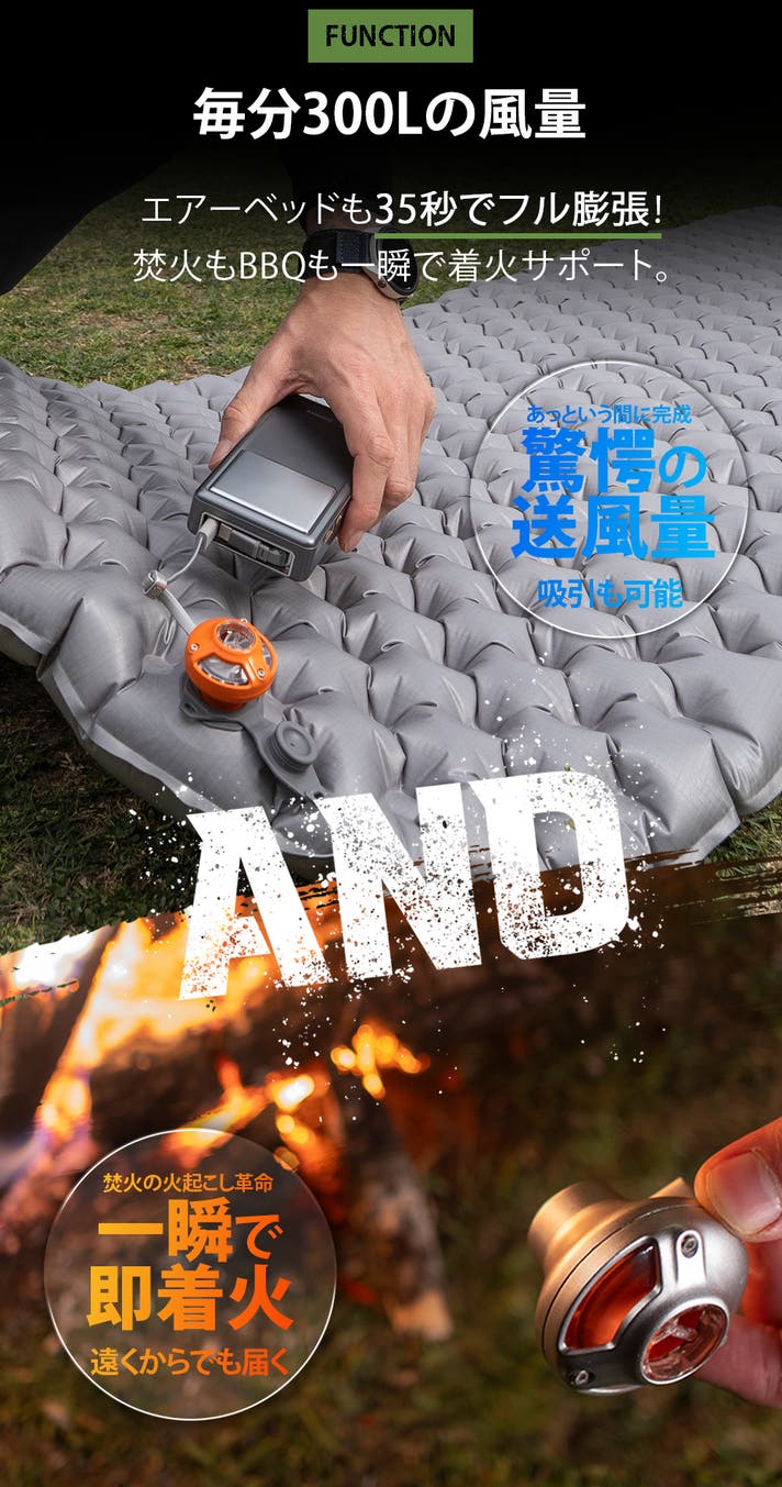- 【わずか28g】手のひらサイズに詰めた圧倒的300L/分パワー。空気入れ/抜き、火起こしも一瞬