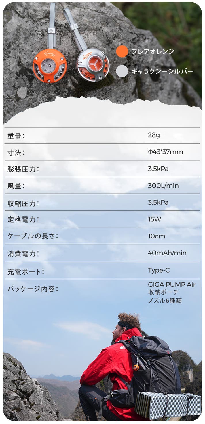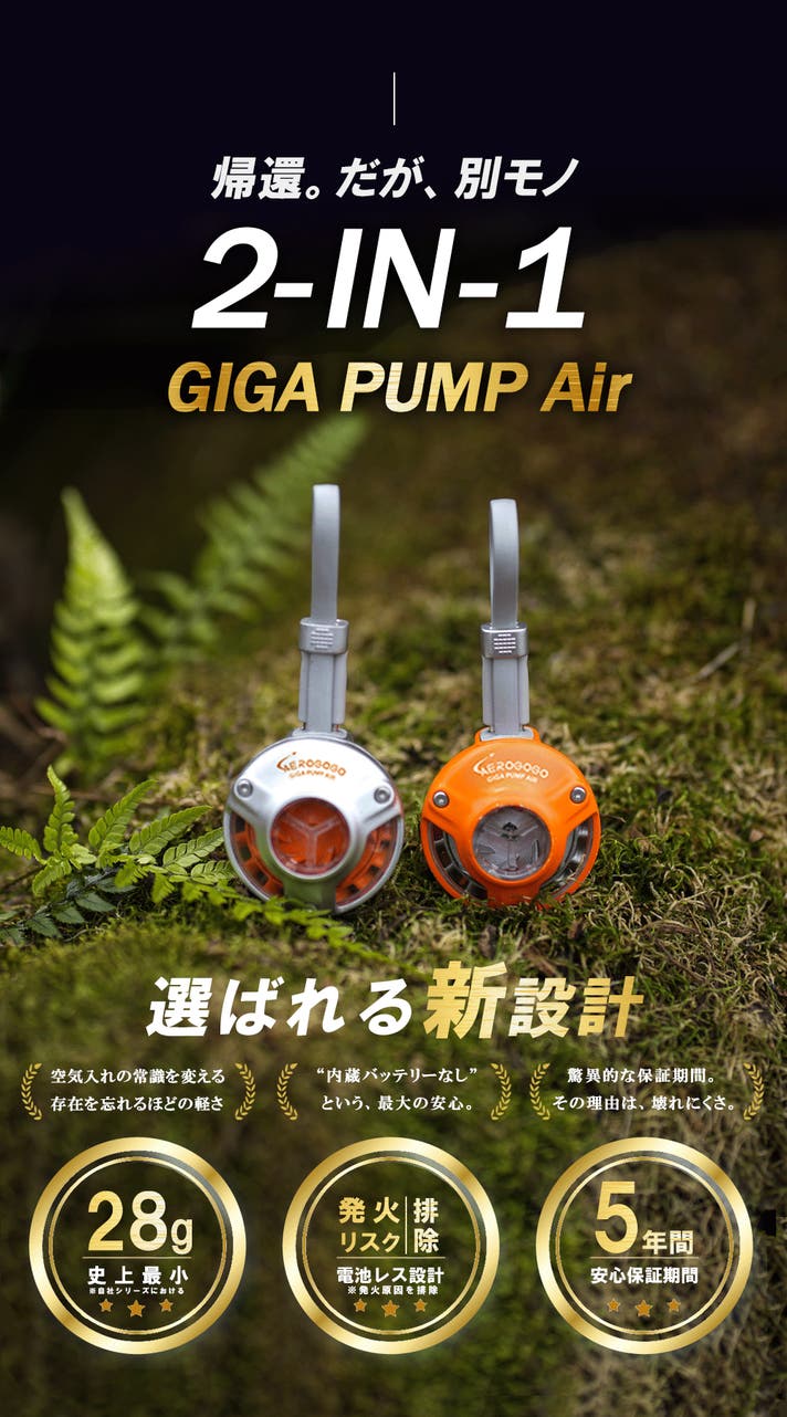 宇宙技術が生んだ究極のエアーポンプ!全世界で話題沸騰中!5年保証付き・内臓バッテリーレスの革新設計。高速膨張と火起こしも瞬時に叶える、アウトドアの新定番『GIGA PUMP Air』がついに日本上陸。リターン品の配送が完了するまで、合同会社MODはAEROGOGOの日本における独占販売権を有する正規代理店です。詳細に関しては、ページ下部のリスク&チャレンジをご確認ください。正規代理店を通じた初の正式販売となります。