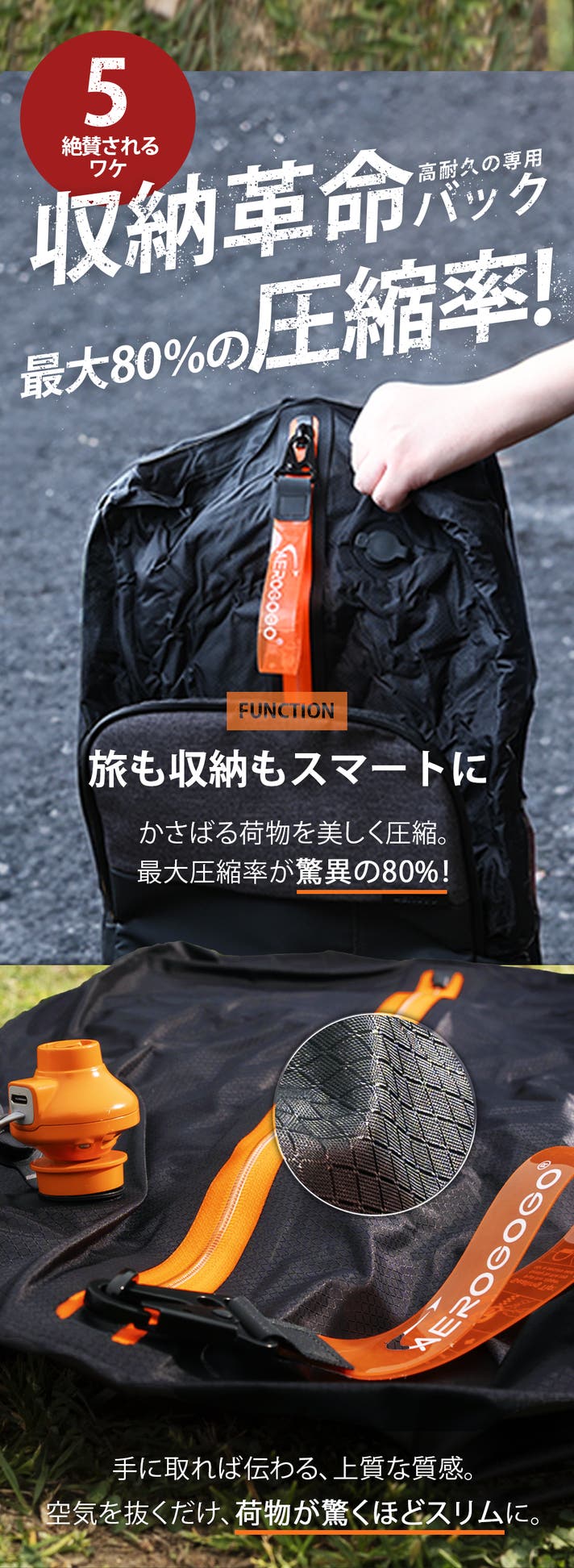 最大80%の圧縮率で、省スペース化を実現し、バッグやクローゼットの整理も劇的に簡単になります。