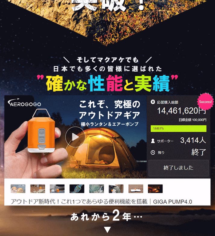 「Makuake(マクアケ)」は、実行者の想いを応援購入によって実現するアタラシイものやサービスのプラットフォームです。このページは、 プロダクトカテゴリの 「宇宙で進化した“小さな怪物”。キャンプに革命をもたらす、究極のエアーポンプが降臨」プロジェクト詳細ページです。
