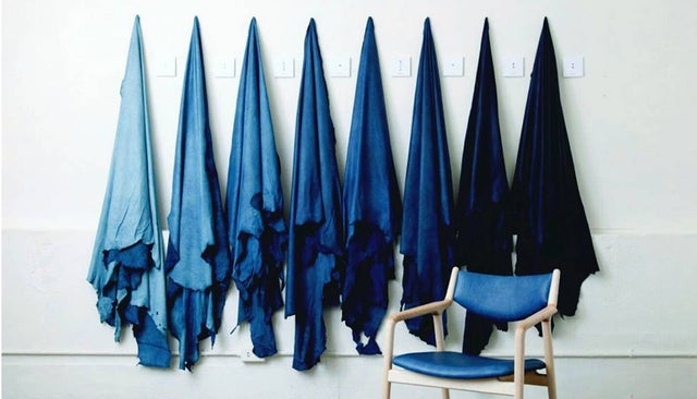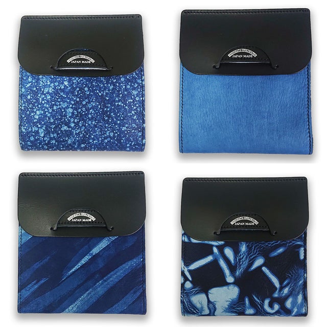 約600年続く伝統製法から生み出される天然染料『蒅』(すくも)を使用。 天然染色による繊細で味わい深い色合いを、色彩豊かに8色のグラデーションとして表現しました。 デザインレザーとして、伝統染色技法である「絞り染め」や「ローケツ染め」を施したレザーもラインナップしています。