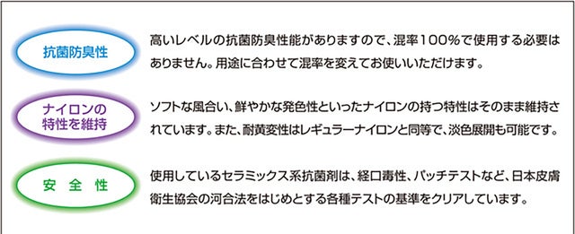 内装にはナイロン糸1本1本にセラミックス系抗菌剤を練り込んだ特殊素材を採用しています。従来のものに比べ耐久性が高く、効果が長期間持続します。