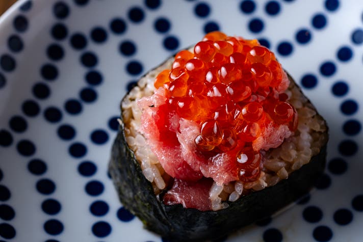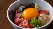 本まぐろと地きんめをあしらったご飯に、いくら醤油漬け、地魚そぼろ、卵黄をトッピング。