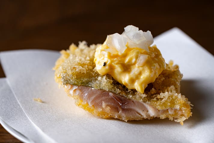 そのほかにもずわい蟹をほぐしてシャリとまぜ、混ぜご飯にしたものを俵状に握った「大ずわい蟹俵鮨」や、鮮度抜群のあじを30秒間だけ油で揚げ、特製のタルタルソースをあしらった「レアあじフライ」など、海の幸が勢揃い。