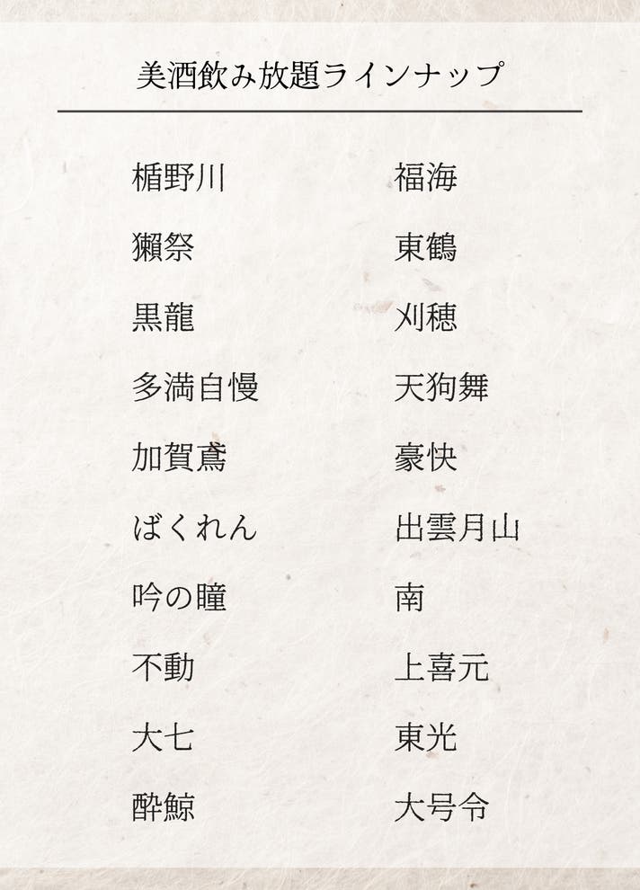 而今や田酒など希少な銘柄も含み、それらを飲み放題でお楽しみいただけます。