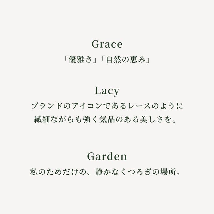 そうして始まったのが、グレイシーガーデンです。ブランドのアイコンとして選んだ素材はファッションにおいて長きにわたり人々を魅了してきたレース。私たちはこのレースを「自身の可能性を再認識させてくれる、希望の象徴である」と定義しました。レースを纏う姿が、私たちの内に秘めた可能性や強さを静かに際立たせるからです。