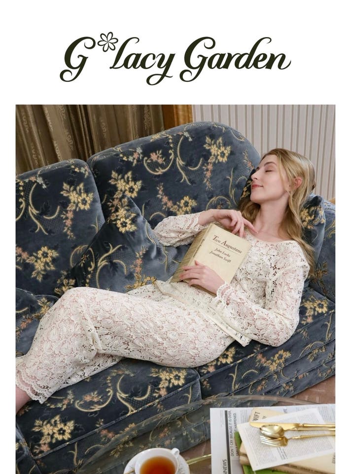 グレイシー“ガーデン”という名前の通り、私たちはお家でのリラックスタイムを「まるでお庭の中に身を置くような、穏やかなひととき」であると捉えています。レース柄には自然をモチーフにしたデザインを採用。