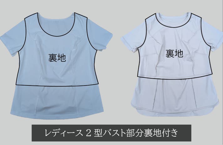 レディース商品は、前身頃のバスト部分を二重にして、ブラジャーが透けにくい仕様にしております。