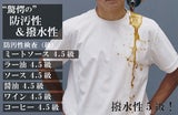 写真撮影では取り直しを含め1.5ℓのコーヒーをかけました。しかし、しっかりと撥水してくれてスタッフ一同改めて素材の凄さに感動!もちろんトマトソースパスタでもOK!
