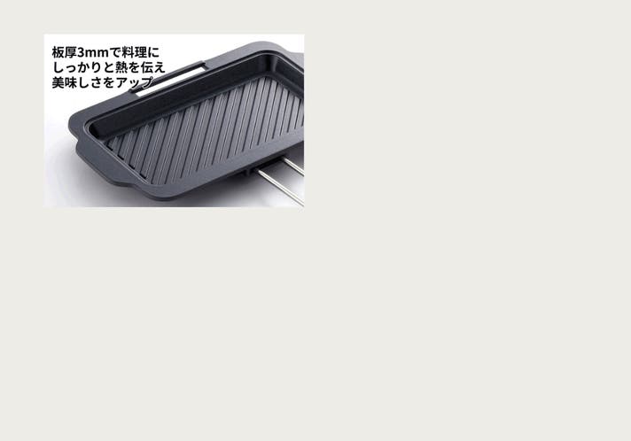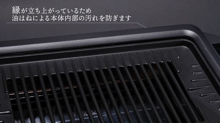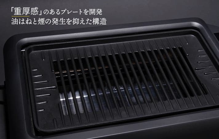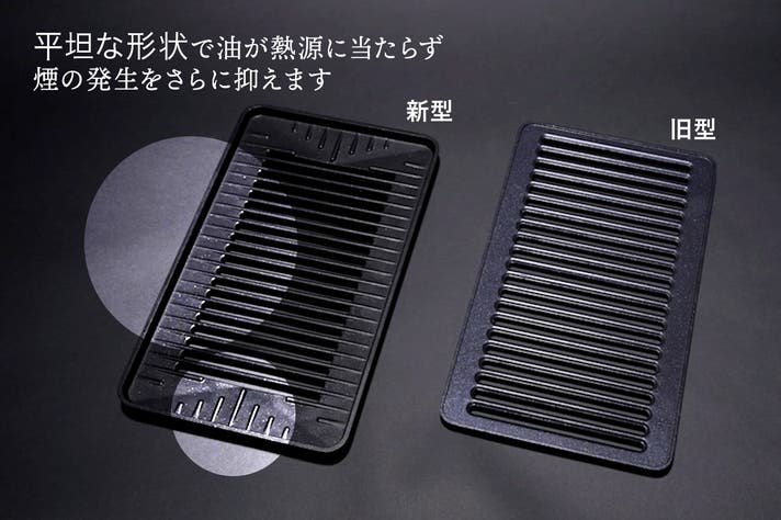 - 独自設計で煙・油ハネを大幅カットする超少煙性能。新型プレートによりさらに煙が立ちにくい!