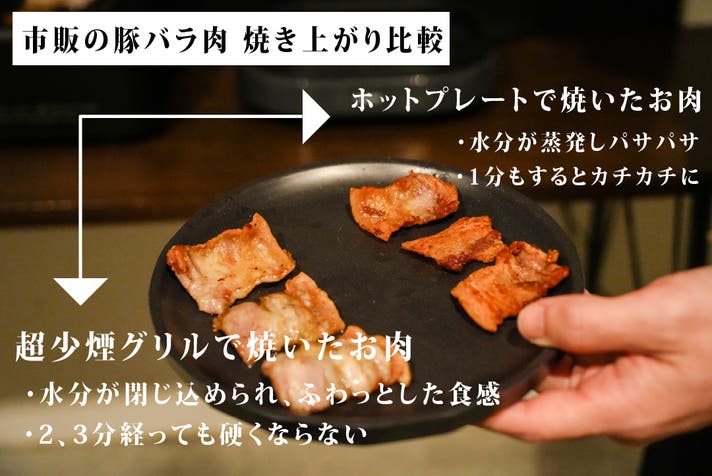 多くの家電量販店にもいき、実際に調理器具を10種類ほど購入しましたが、ホットプレート型はどうしても煙が立ち、お肉の水分が飛び、フライパンで焼いたような舌触りとなり、お肉がお店ほどおいしくならず、無煙を謳っている製品も、熱が強すぎるのか煙が立ってしまうな...と感じました。