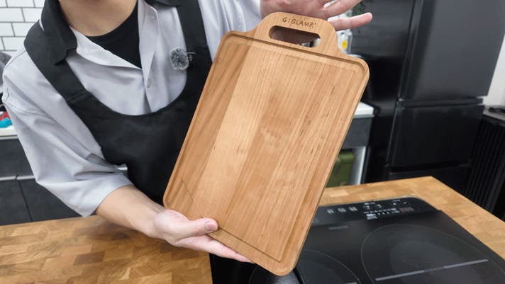 ↑天然木を使ったカッティングボードの大きさは「横34x縦23x厚み1.5cm」、重さが673グラム。取っ手があるので持ち運びしやすく、溝が彫ってあるので、肉汁が机に溢れる心配がありません。