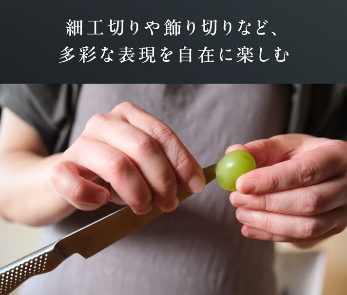 GLOBAL-PRO Bartenderは、わずか65gという驚きの軽量設計。手の小さな方や料理初心者でも扱いやすく、長時間の使用による負担も軽減。毎日のフルーツカットや子どものお弁当づくりも、軽やかに楽しめます。