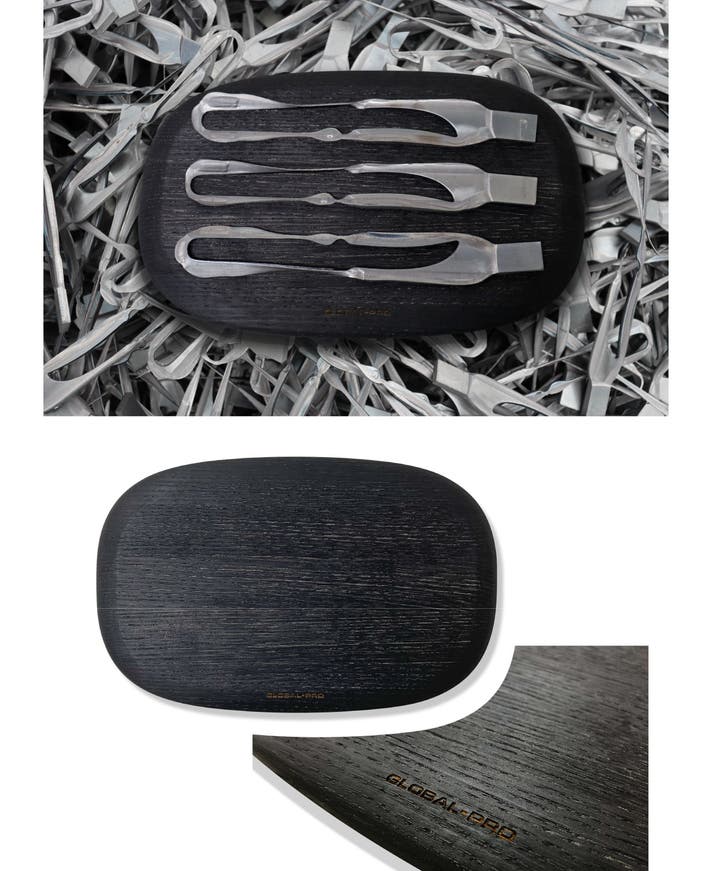 栗材のまな板を制作していたとき、ナイフを置いた部分だけ木の表面が黒く変色していることに気づきました。調べてみると、栗に含まれる「タンニン」という成分がステンレス刃物鋼に含まれる炭素と反応して色が変わっていたのです。この偶然の発見をきっかけに、鍛造ナイフを製造する際に出る端材を活用し、着色料を使わずに栗の木を黒く染める方法を考案しました。この「鉄媒染」という仕組みを応用して、ブラックカラーのカッティングボードが誕生しました。