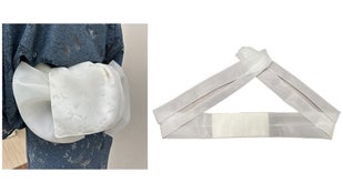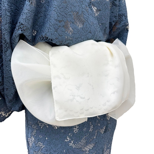 オビの端部には、キモノと同様のレース柄をアクセントとして入れています。また素材は、軽くて結びやすいダンボールニット素材です♪