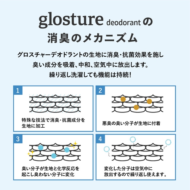 幅広い悪臭に対応できるグロスチャー デオドラントの高い消臭機能で不快な臭いをカットします。