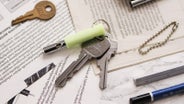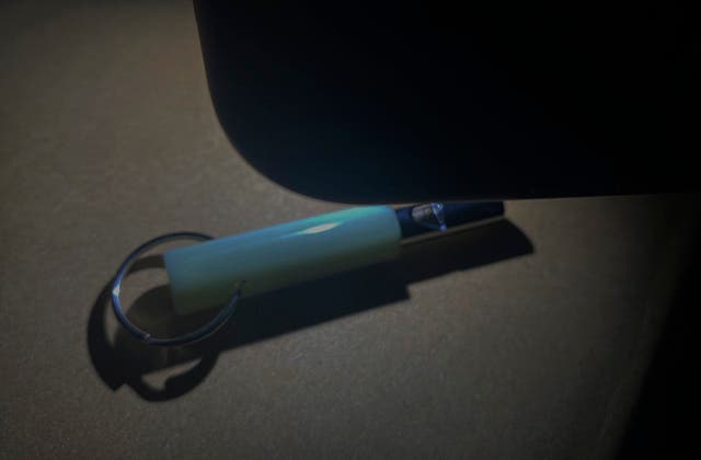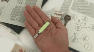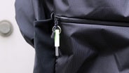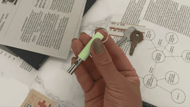 鍵をつけるとこんなイメージです。キーホルダーとしてつければ、暗いところでも鍵の置き場所がわかります。