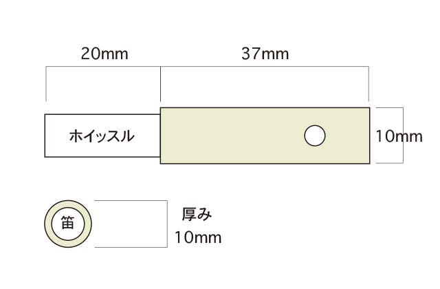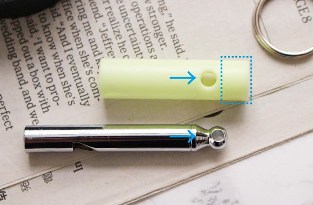 ホイッスル部分は真鍮製クロームメッキです。しっかりと密着し、矢印のホイッスルの穴の部分とカバーの穴の部分ピッタリ重なりますので、ズレ落ちることはありません。また点線部分が笛よりも大きくなっていますので、蓄光素材を多く使えるようにデザインしました。