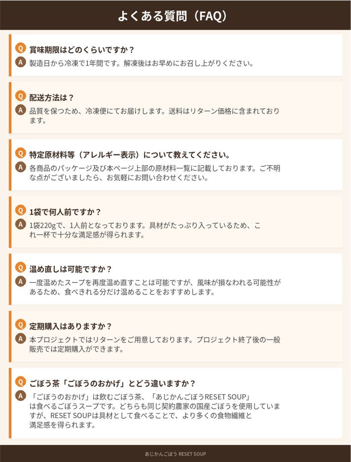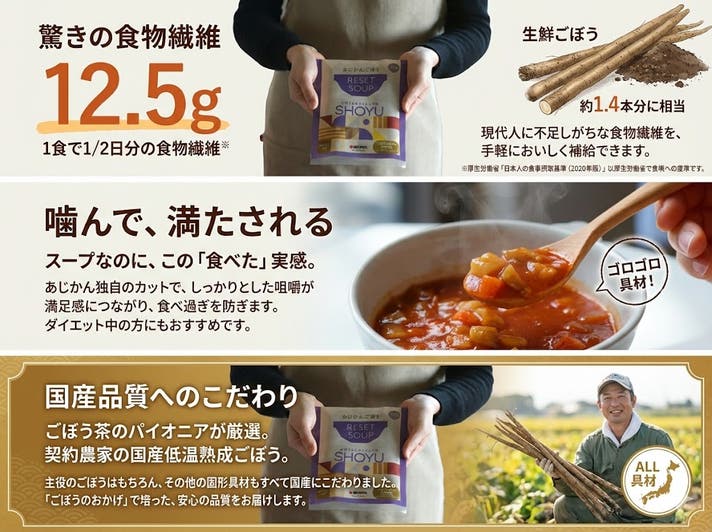 私たちは、長年ごぼうと向き合い、その秘められた力を引き出す「焙煎ごぼう茶」を多くのお客様にお届けしてきました。そのあじかんが、"飲む"から"食べる"へ、新たにご提案するのがこの「RESET SOUP」です。