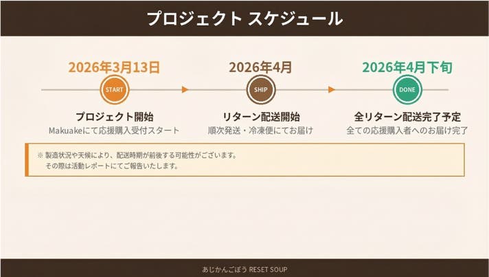 このプロジェクトはAll in型です。目標金額の達成に関わらず、プロジェクト終了日の2026年03月30日までに支払いを完了した時点で購入が成立します。