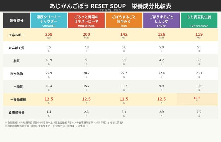 種類:5種類(チャウダー、ミネストローネ、旨辛みそ、しょうゆ、豆乳生姜)