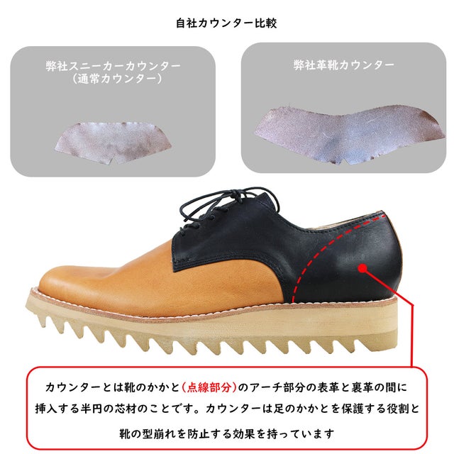 カウンター部分は溶剤を使用する事が多くあります。理由としては成形しやすく、コストも安い所にあります。しかし溶剤のカウンターは例えるならコンクリ―トの様な物です。固まってしまったら変形はしません。弊社はカウンターに革製の物を使用しています。革製を使用する事により、履いている内にお客様の足に馴染みます。また通常より大きいカウンターを使用する事により、踵を包む範囲が大きくなり踵のホールド部分が増え安定します。
