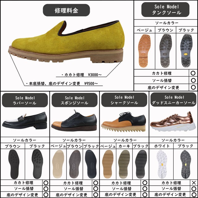 弊社では長く愛用して頂く為、ソールリペアも行っております。同じ底で修理するのも1つですが、是非シュミュレーションを利用し違うソールで修理してみて下さい違う雰囲気が出て愛着の湧く1足になると思います。